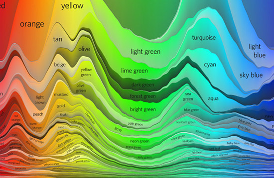 Here’s another visualization of the XKCD Color Survey dataset, broken down into the 200 most common color names. The format used here is really interesting, and not something commonly seen.
