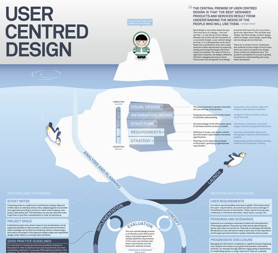 This infographic breaks down the elements of user-centered design, as well as the process of creating such designs.