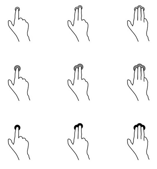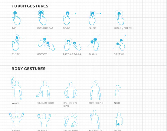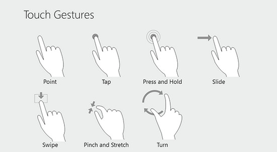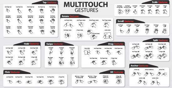 tap; double tap; drag; flick; pinch; spread; press; press and tap; press and drag; rotate; scroll; multi-finger drag; squeeze; two-finger drag; drag hand; 2 finger drop up/down; thumb/3 finger pitch; wave; pin rotate; drawing “check mark”, “x”, “?”