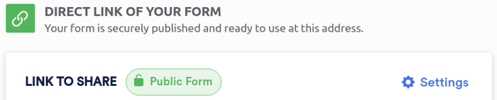 Your form should already be public. If not, go to the settings by clicking the settings gear on the Publish page. Then select Public Form.