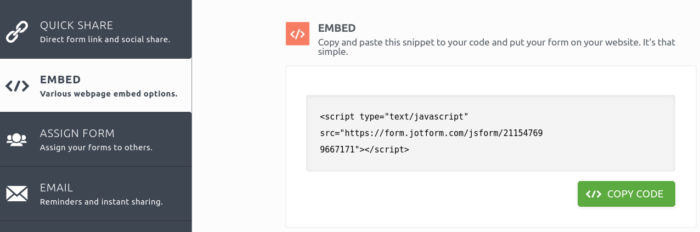 Now switch to the Embed tab and use the green Copy Code button to copy your code. You may want to hold off on this step until you get your Carrd page set up. But when you’re ready, this page will be waiting for you.