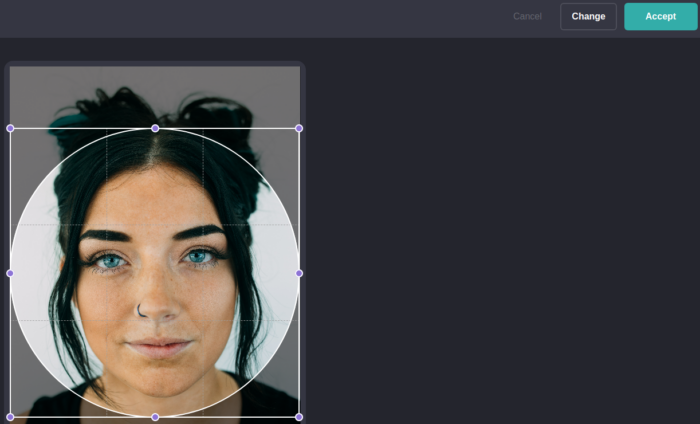 Next, click on the profile photo on the page and select Upload. You can use your own photo or snag one from Unsplash if you don’t have one handy. After you’ve uploaded the file, you can crop it by dragging the blue handles.
