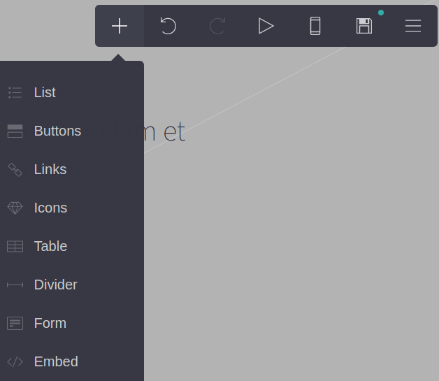 Now you’ll have room to embed an element on your page. Start by clicking the + from the menu in the upper left. Select Embed from the dropdown menu. This is where you’ll embed form code from Jotform into your Carrd page so visitors can submit their information directly from your site.