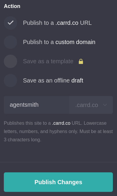 After that, scroll to the bottom, select Publish to a .carrd.co URL, choose a sub-domain name, and click on the Publish Changes button.