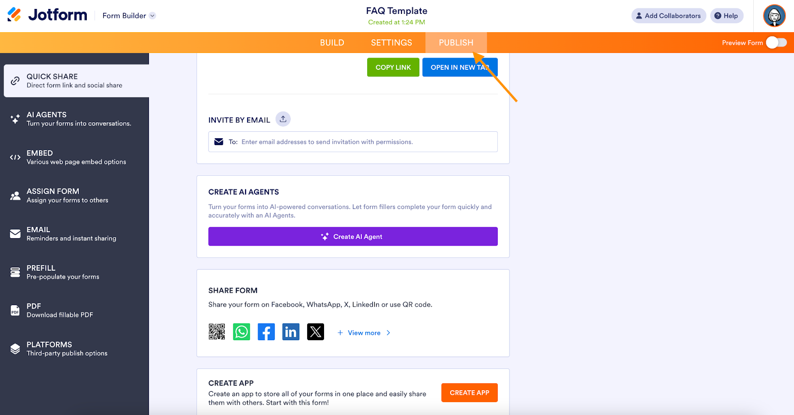 - Use the Publish button to get a shareable link or embed the FAQ directly into your site.