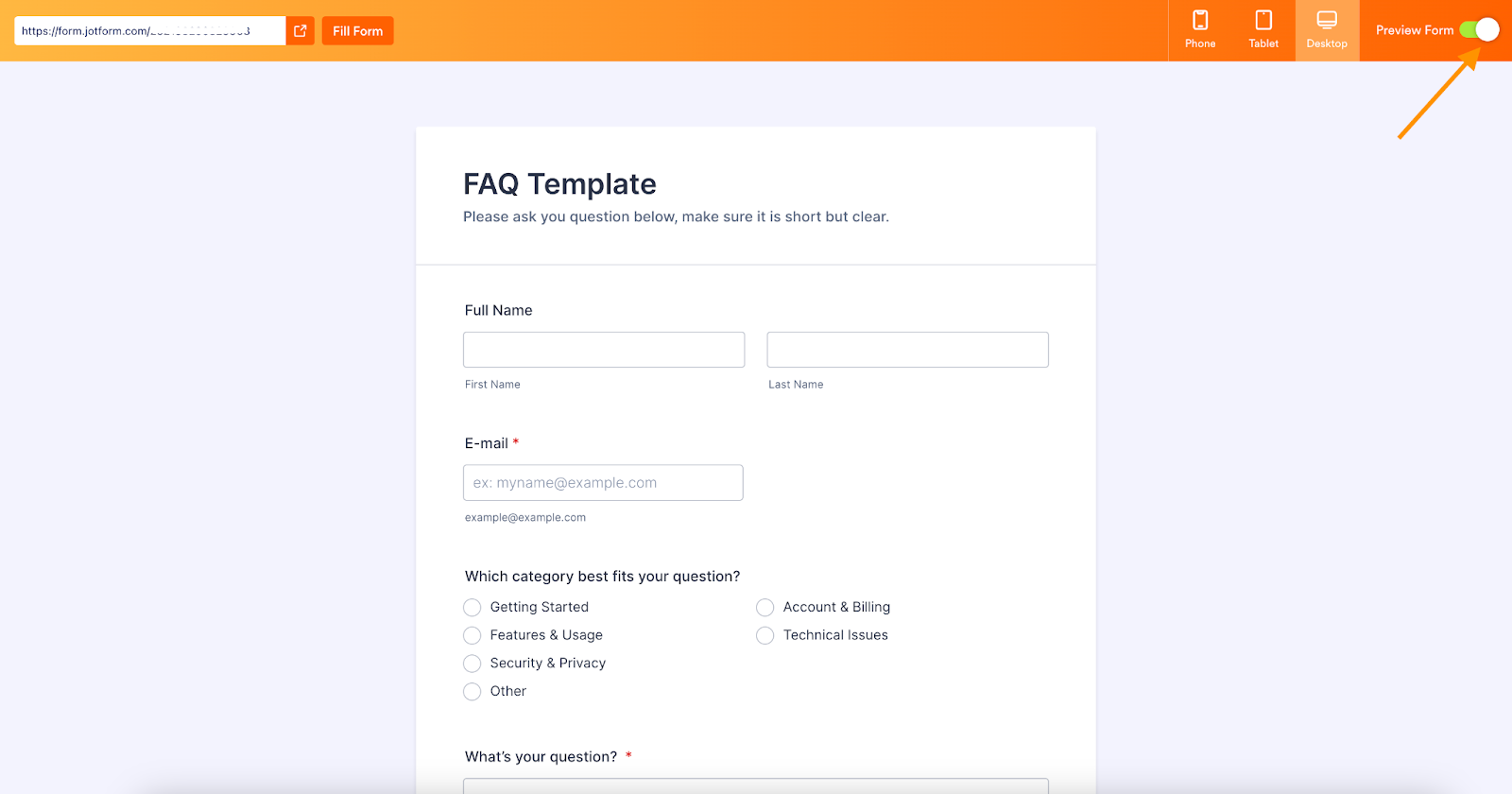 Jotform makes it incredibly easy to create customized, interactive FAQ templates for any purpose — whether for customers, employees, or event attendees. Are you looking for a template to collect different questions for your FAQ page? Try Jotform’s FAQ form template.