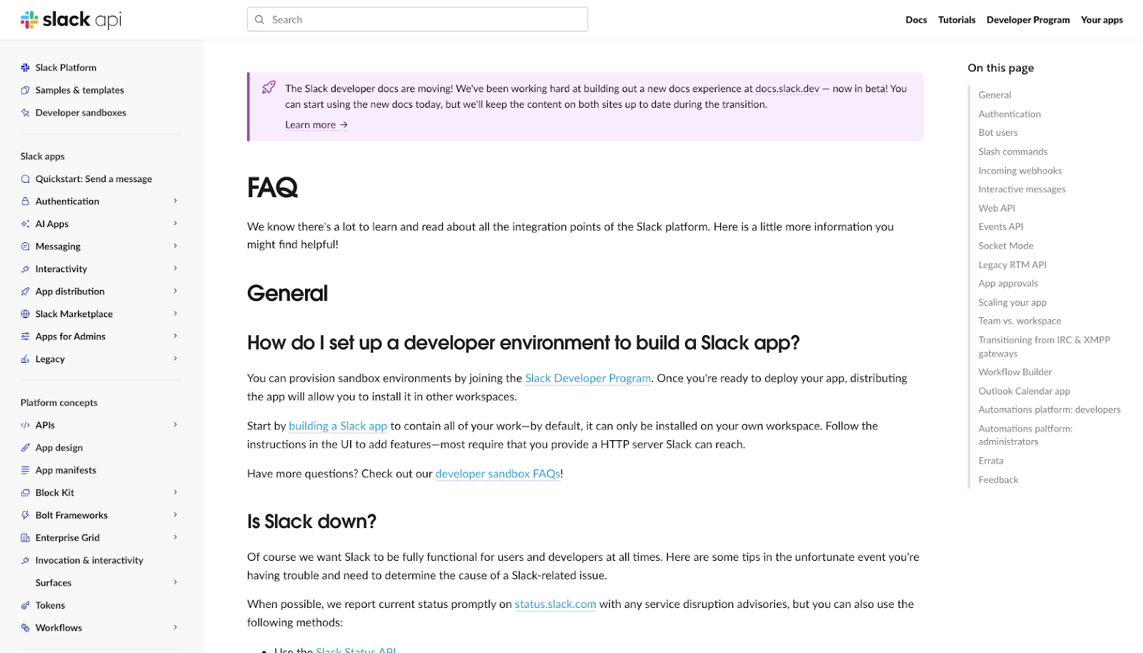 Slack’s help center is a comprehensive knowledge base that serves a variety of users. While it provides a clean and modern design for general questions, its resources also include a detailed FAQ specifically for developers using the Slack API, covering technical topics from authentication methods to rate limits and API best practices. This demonstrates a strategic approach to providing support for both general users and a highly technical audience.
