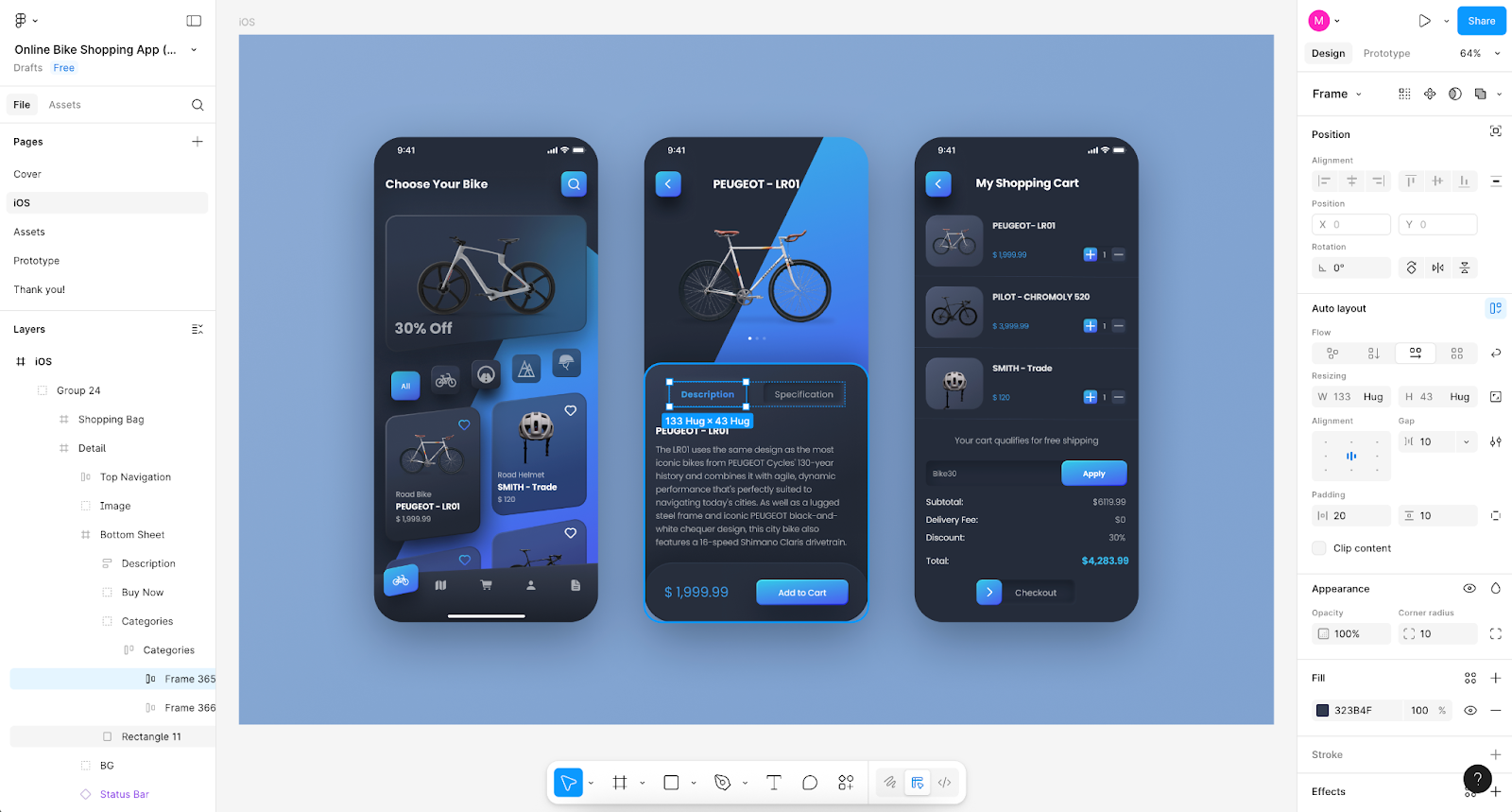 Figma is, first and foremost, vector design software for collaborative interface design. It uses HEX color codes, pixel-based sizing and spacing, and web-style column and grid layouts by default. When you switch over to the Prototype tab, you can link elements together into interactive prototypes. The default editor is a blank canvas, but you can also design on a frame with built-in sizes for iPhones, iPads, Android devices, desktops, TVs, and smartwatches.