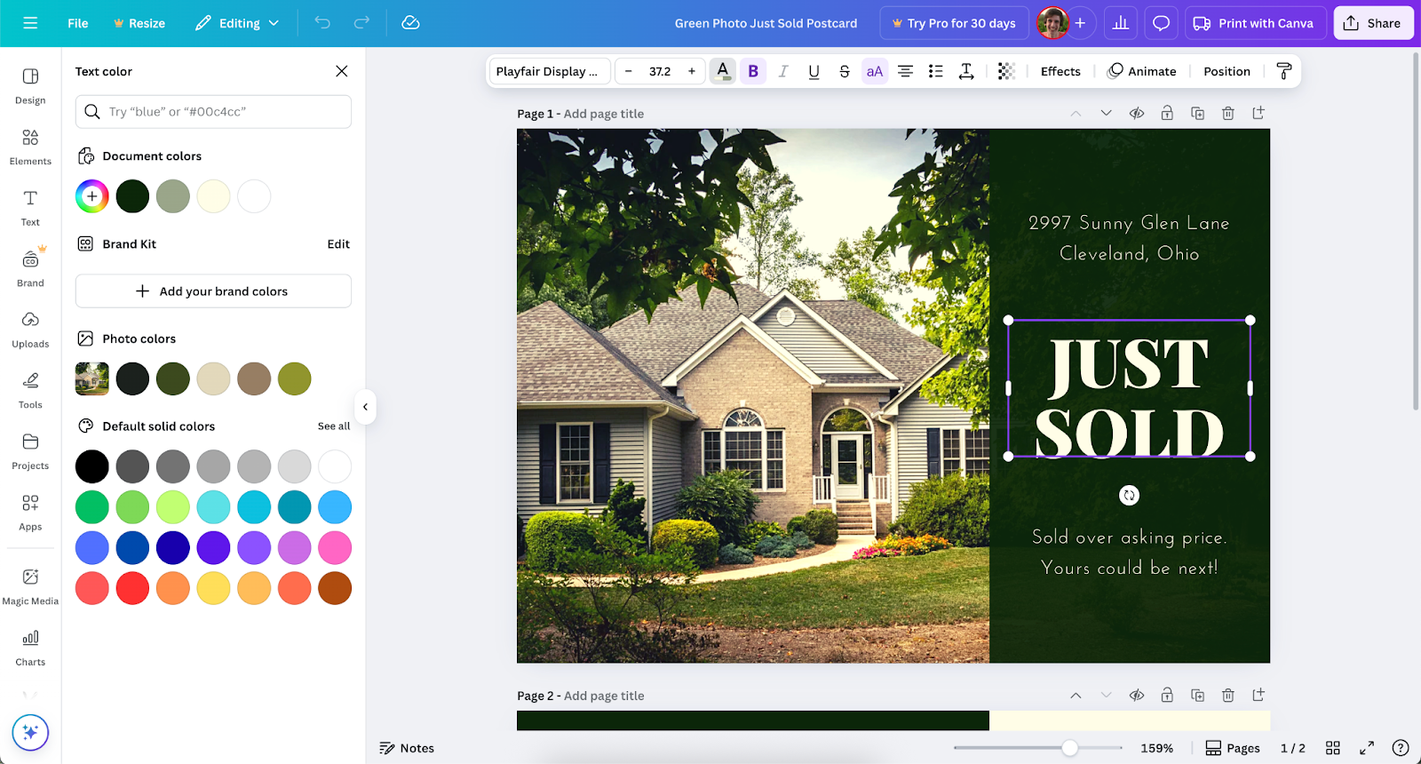For example, take customizing a design with colors that look great together . In most design apps, you could first add a photo to a template, then use the eyedropper tool to select colors from a photo — the shade of green from a leaf, the brown from sand, the blue from the sky — to make your design’s headlines and body text match the photo. Canva simplifies this process down to a single step. All you do is add the photo, then edit text in the template, and the text color picker will automatically show colors from your photo that Canva extracted automatically.