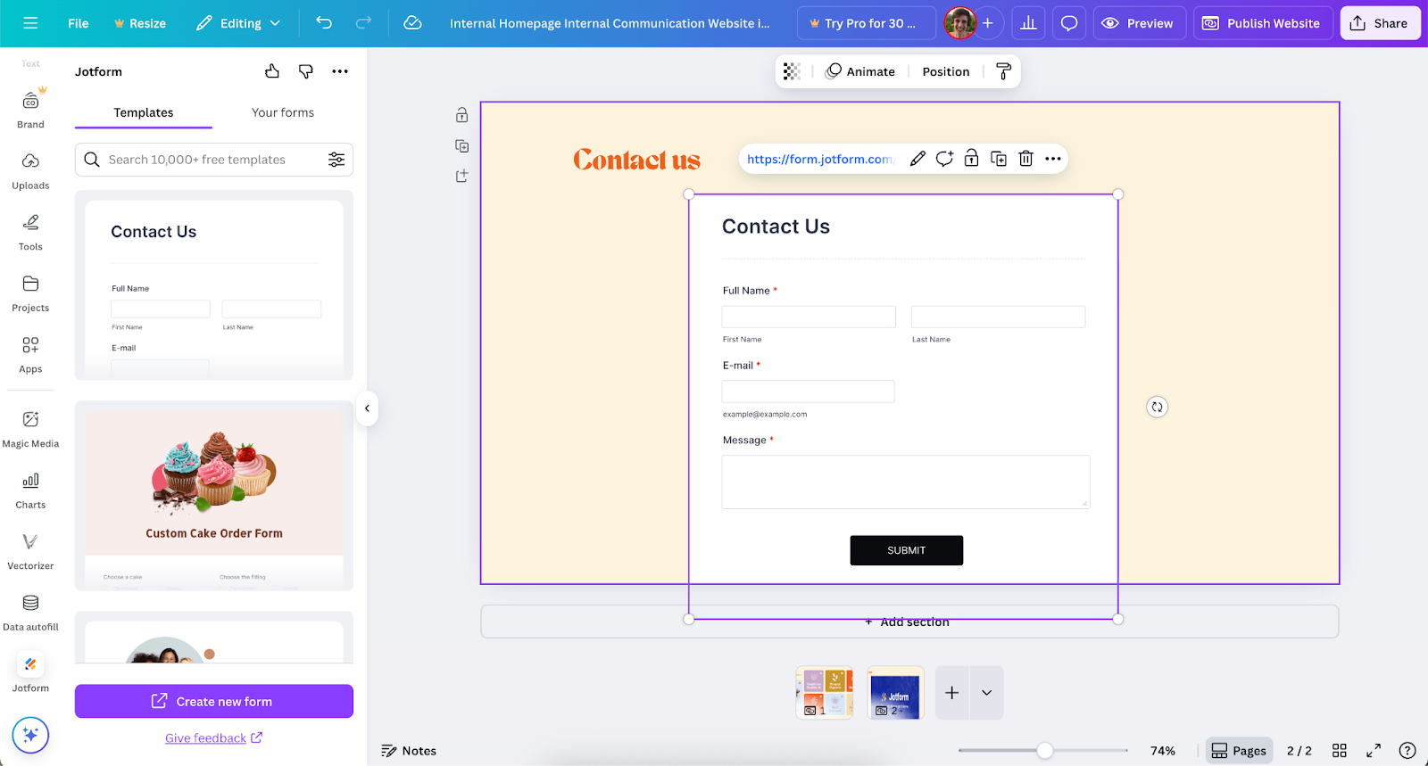 To do this, you could start with the larger design, building out a website from a Canva template with a built-in Jotform form in Canva from one of over 10,000 free form templates, and publish that as a Canva website — complete with a custom domain if you‘d like. With a Jotform form in your Canva website, you could collect e-signatures for contracts, or you could start a small store with secure payment processing through PayPal, Stripe, or Square. You could even build automated approval workflows or dynamic forms with conditional logic to turn your Canva site into a mini app without coding.