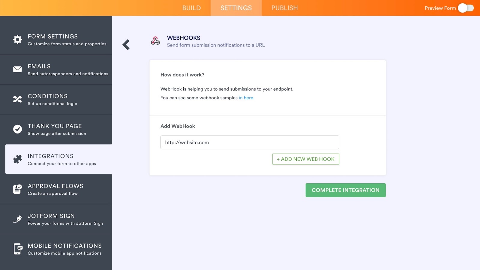 The Webhooks integration helps you send notifications about form submissions to a URL of your choosing. All you have to do is copy and paste a link to set it up. We have a guide available to walk you through the steps.