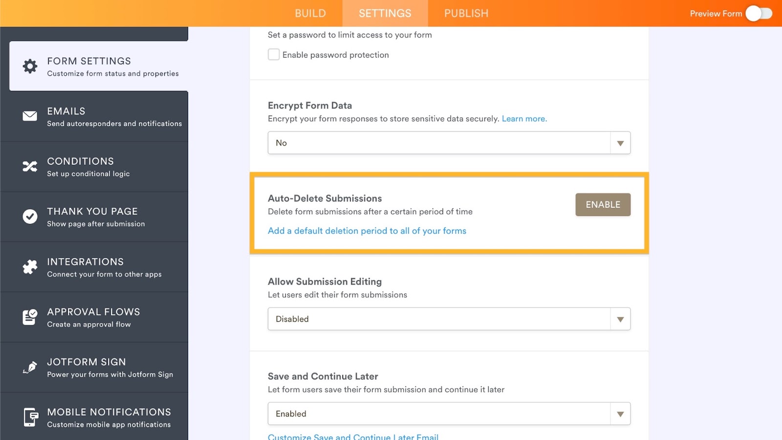 You can automatically delete submissions when you transfer submission data elsewhere. This is great if you have sensitive data you want to keep on only one platform or you want to make space. You can also schedule deletion periods for even more convenience. Check out our help guide for more info.