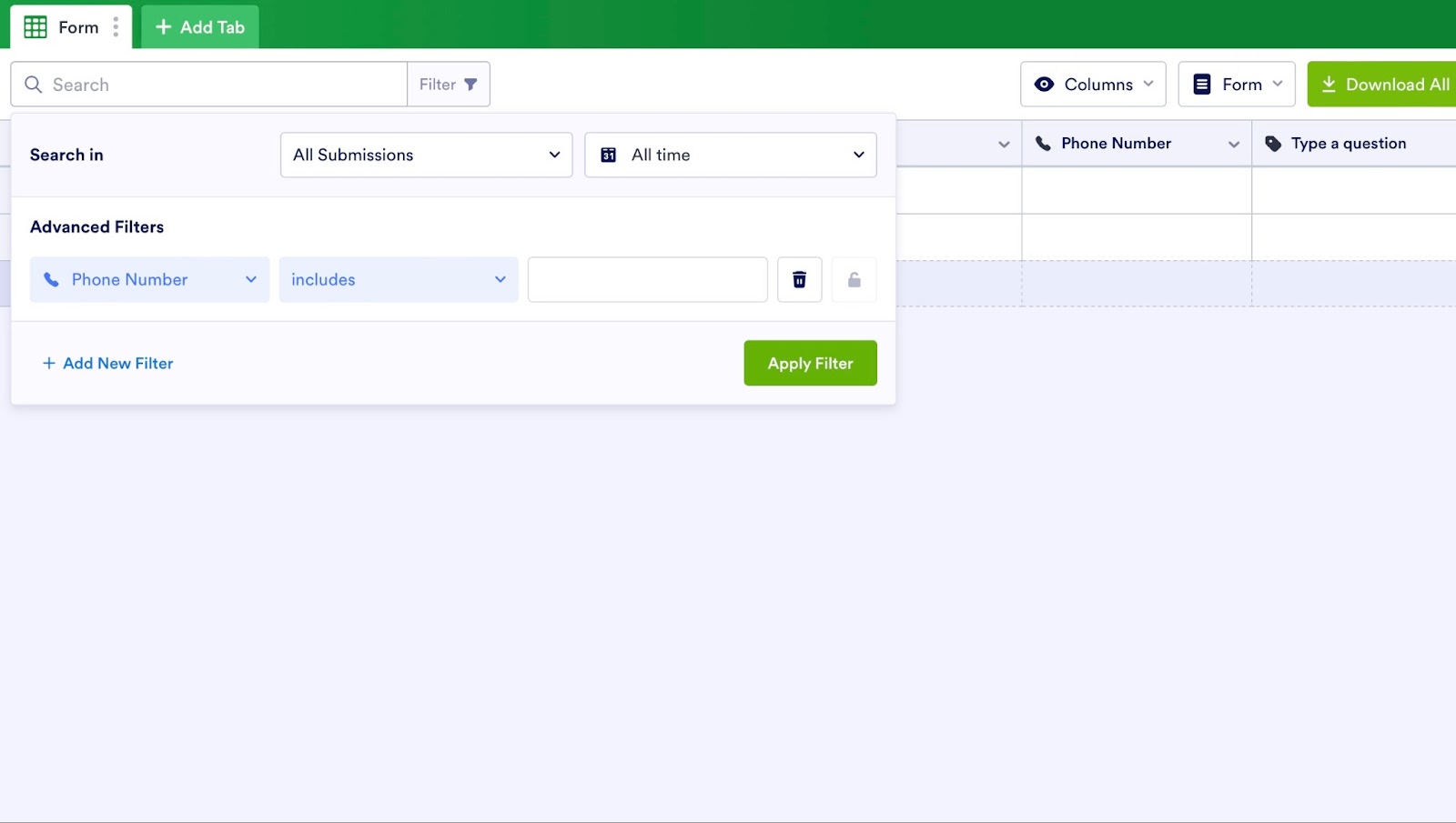 Jotform makes it easy for you to find submission data by letting you filter your search. You can easily add multiple search filters in Jotform Tables, Jotform Inbox, and Jotform Report Builder to find what you need instead of scrolling through entries.