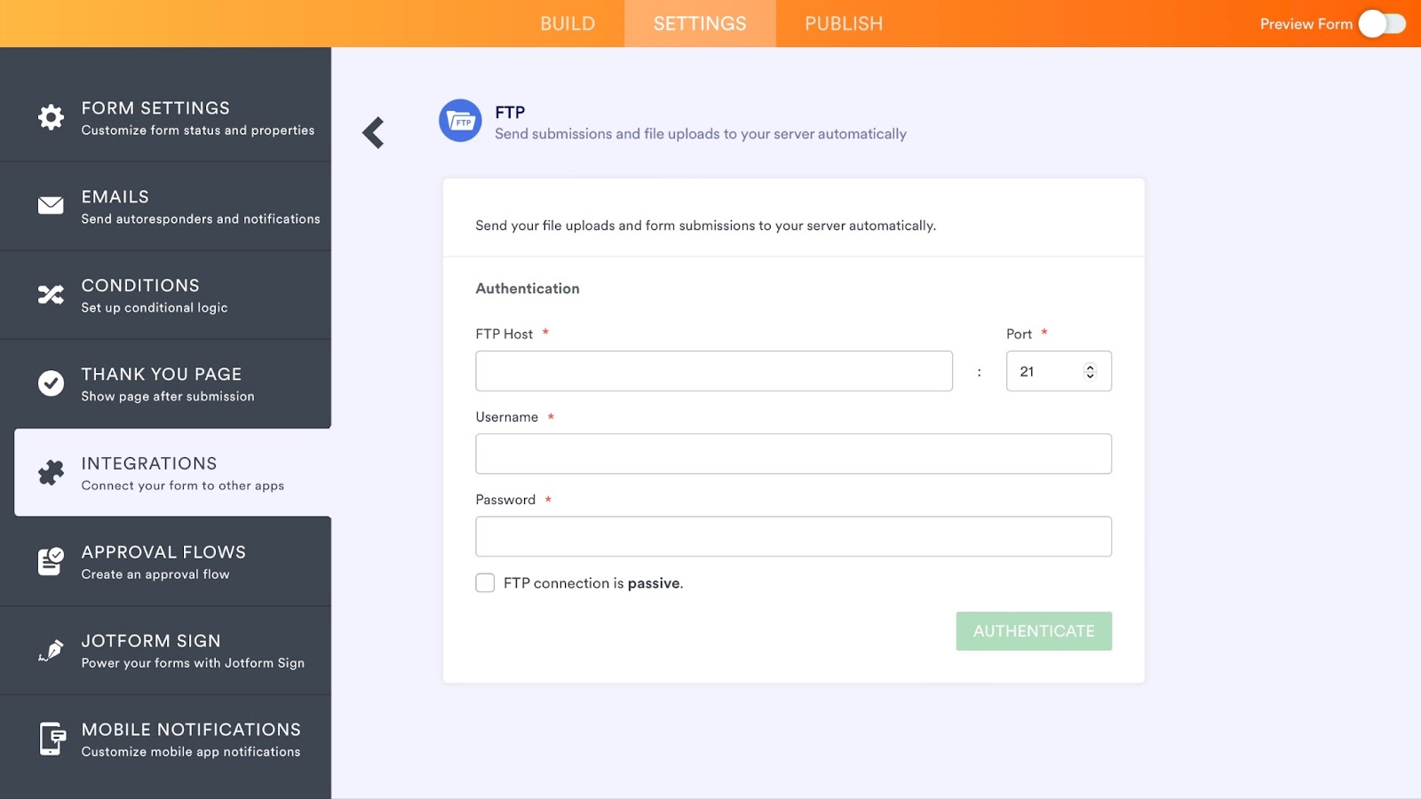 If you prefer to store data in your own server, our file transfer protocol, or FTP, form integration helps you transfer submissions and files from Jotform.