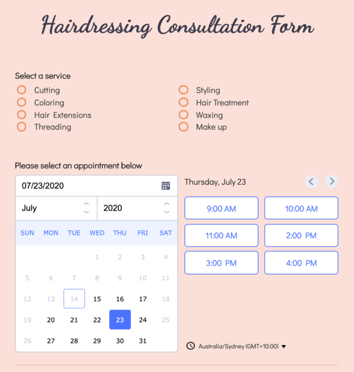 If you have a salon, this consultation form template asks for everything you need from new clients, including their hair condition, some health information, and their preferred service. It also includes an appointment scheduler option.