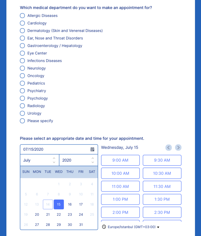 For healthcare practices, every new patient fills out a new patient form. These forms are a great way to let your patients know that you’re back open for business, with appointment slots they can select directly on the form itself.
