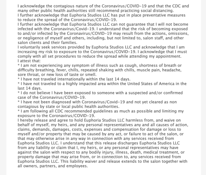 In addition to protecting your customers, you should protect your business. Make sure your clients or customers sign a waiver stating that they understand the COVID-19 risks they may face.