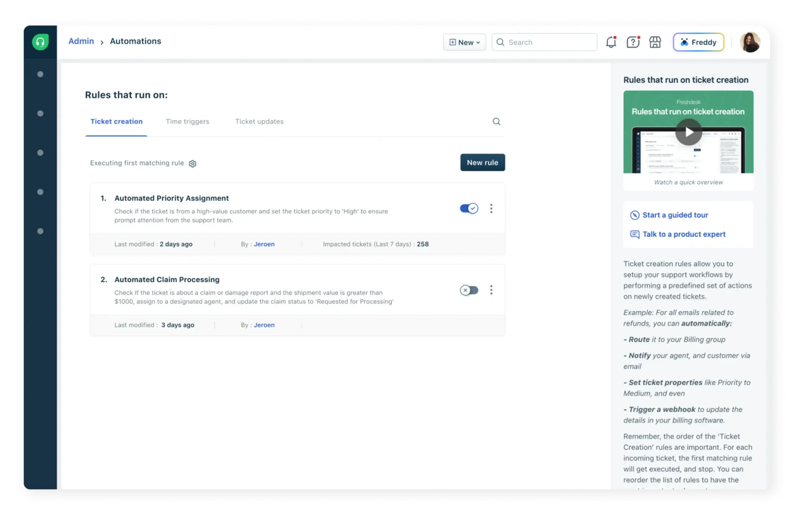 - Streamlined admin: Through various automations, Freshdesk reduces the impact of repetitive tasks on your employees’ workload — allowing them to focus on high-value work.