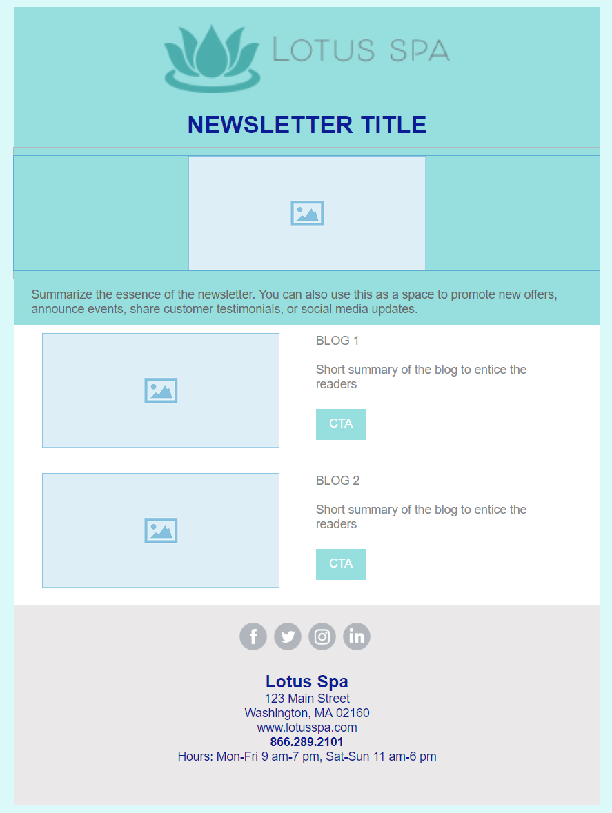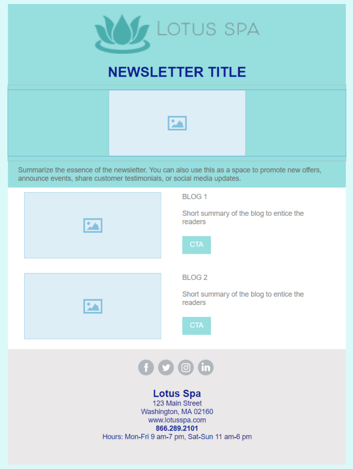 Place your content blocks in a way that highlights each block. Add a summary or introduction for each block. For example, if you’re placing your top three blogs of the month, summarize what the posts are about to lead people to read the full posts. Add a call-to-action button to tell people what action you want them to take.