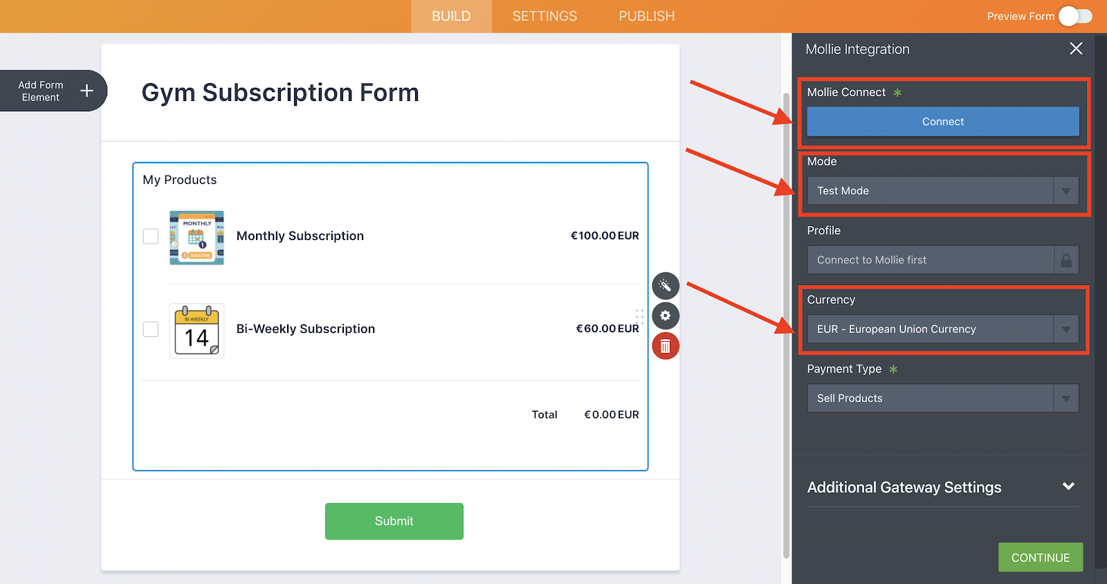 - In the Mollie Integration menu, set the currency to euros (displayed in the settings as European Union Currency), put the integration into Test Mode, and click the Connect button to link your Mollie account to the online payment form you created.