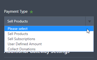 - Choose the payment type: product, subscription, custom amount, or donation.