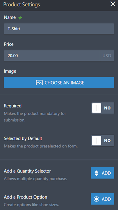 - Click the Create New Product button. On the next page, you can add details about your product, such as a photo and fields for quantity, size, color, etc.