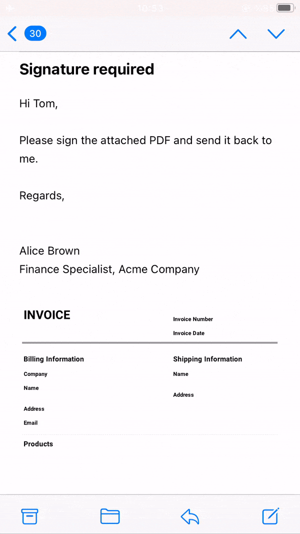 - iOS – Long press the saved PDF file, then select Markup, click the plus icon, then select Signature to insert a signature.