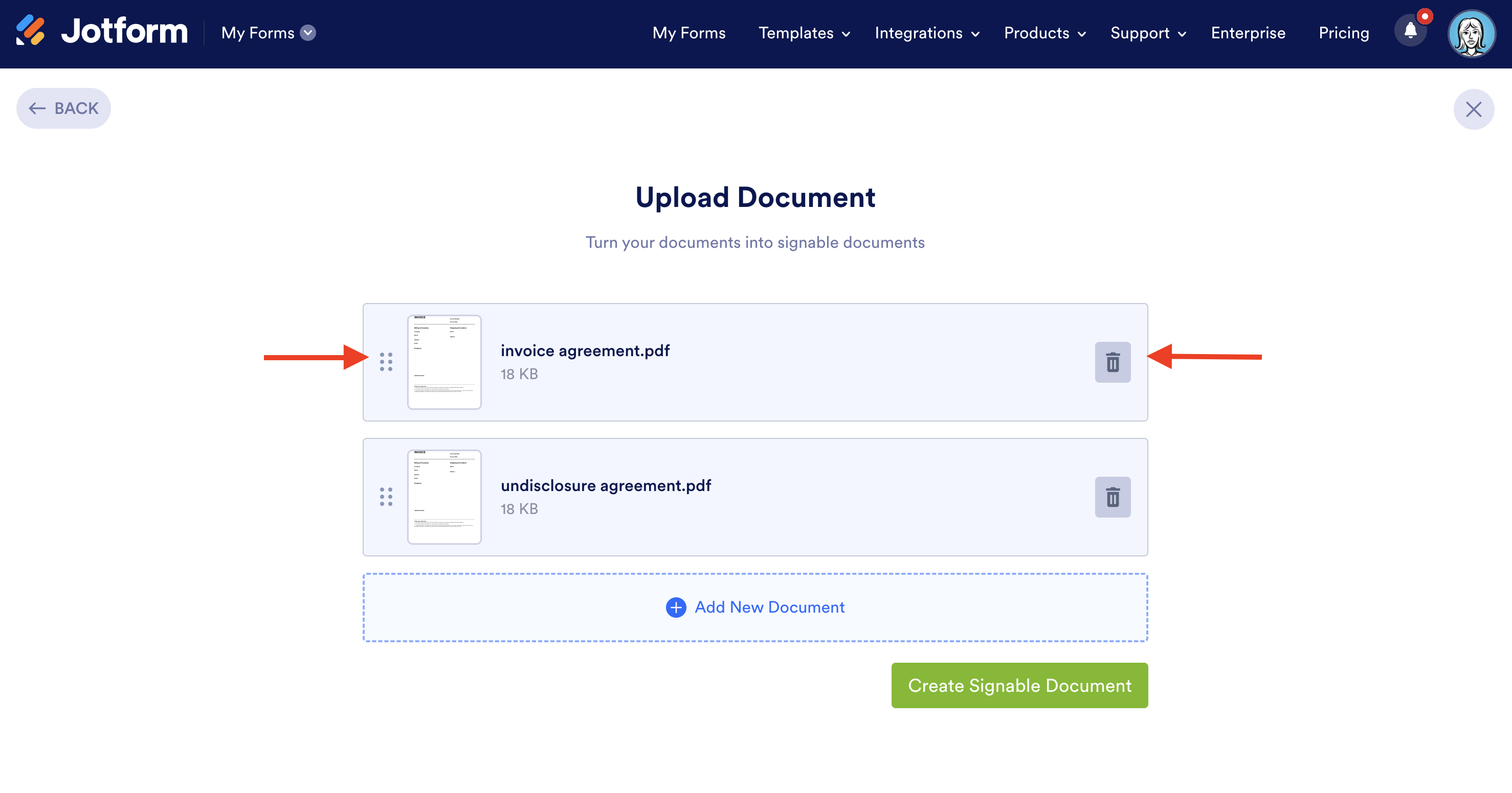 In addition, you can upload multiple documents at once. They will be merged into one signable PDF document. You can change the order of files by dragging them using the six dot icon or deleting the unnecessary ones.