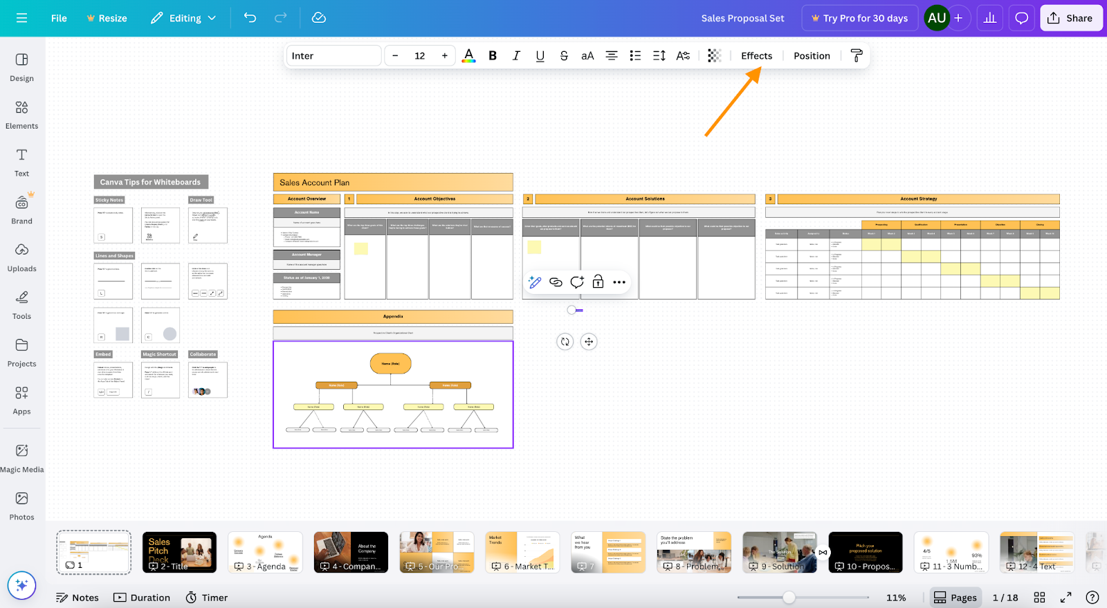 With your text selected, select the Effects button in the top toolbar. This opens Canva’s text effects panel.