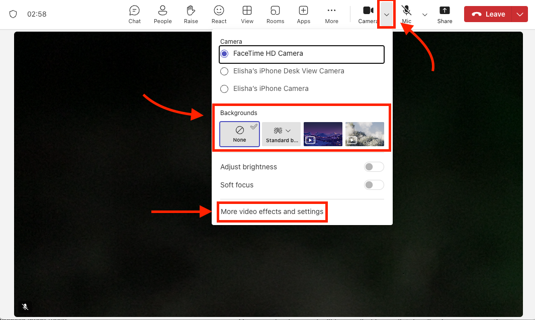 - While in the meeting, click the dropdown arrow next to the camera icon. This will open a menu with a few quick-select options: You can blur your background or choose from a couple of default background images. If you want more options, click More video effects and settings for alternative backgrounds.