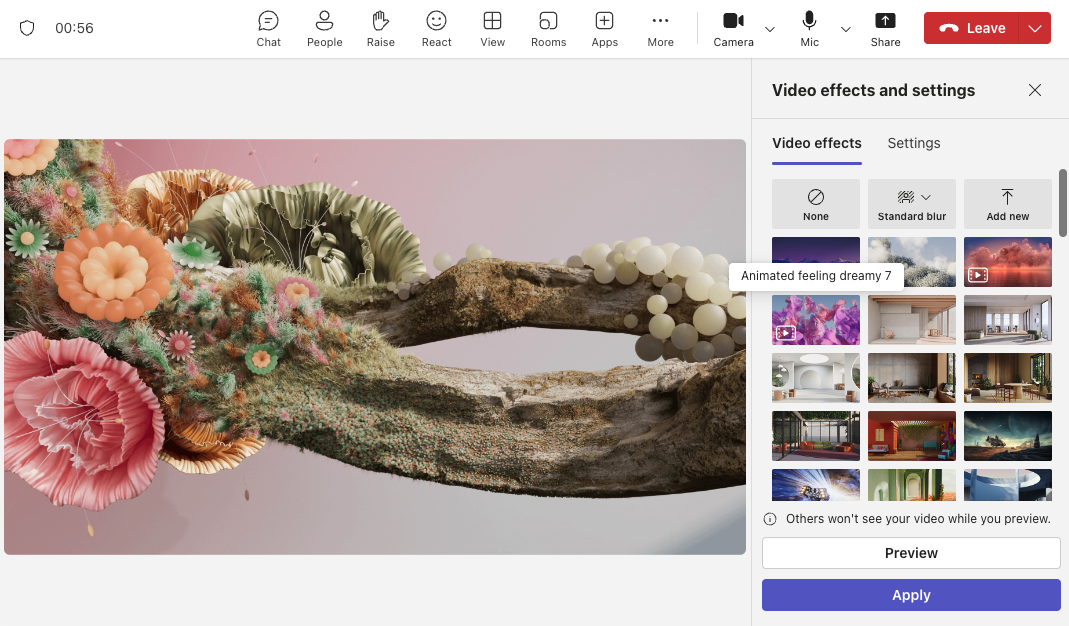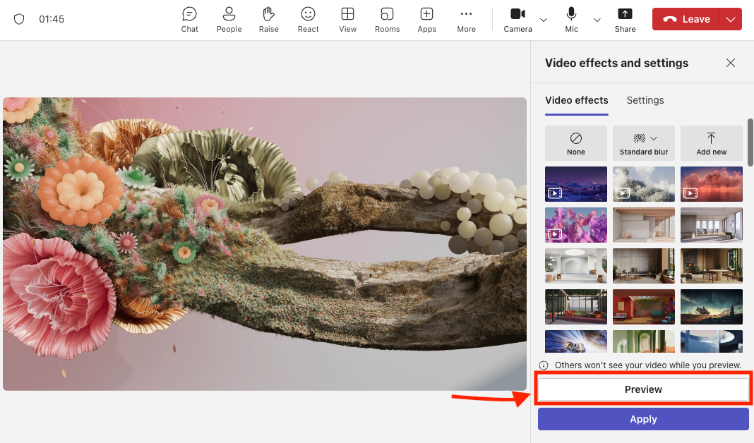- If you want to see a preview of how your new background looks, click Preview. If you’re satisfied, click Apply and turn on video to use your new background in the meeting.