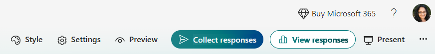 - Click the Share button at the top right. Depending on the version of Microsoft Forms you are using, it may show three dots (ellipses) instead of Share.