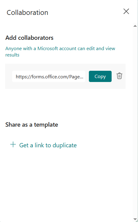 - Share the link to the form you copied with your collaborators. Wondering how to share a Microsoft Form? You have multiple options, including sending the link via text message or email.