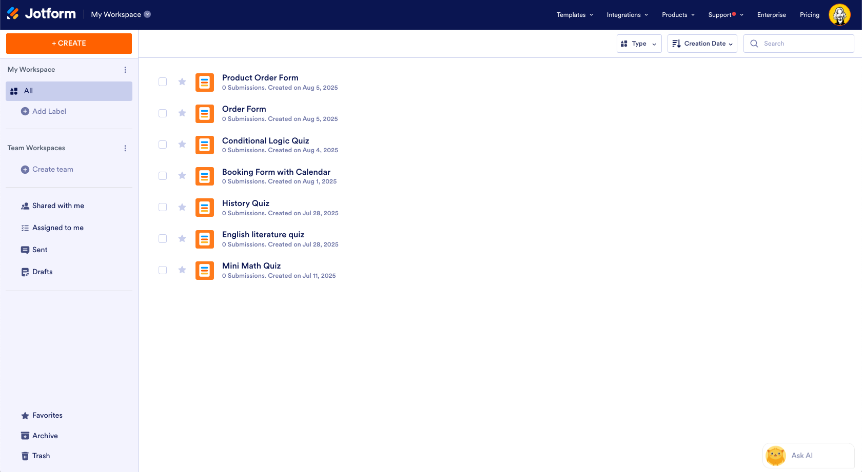 Want to collaborate with others on more than just a single online form? With Jotform Enterprise, you can create shared workspaces using Jotform Teams. Simply create a team in the workspace, invite members, and enable them to collaborate on forms, surveys, quizzes, polls, and other documents with you.