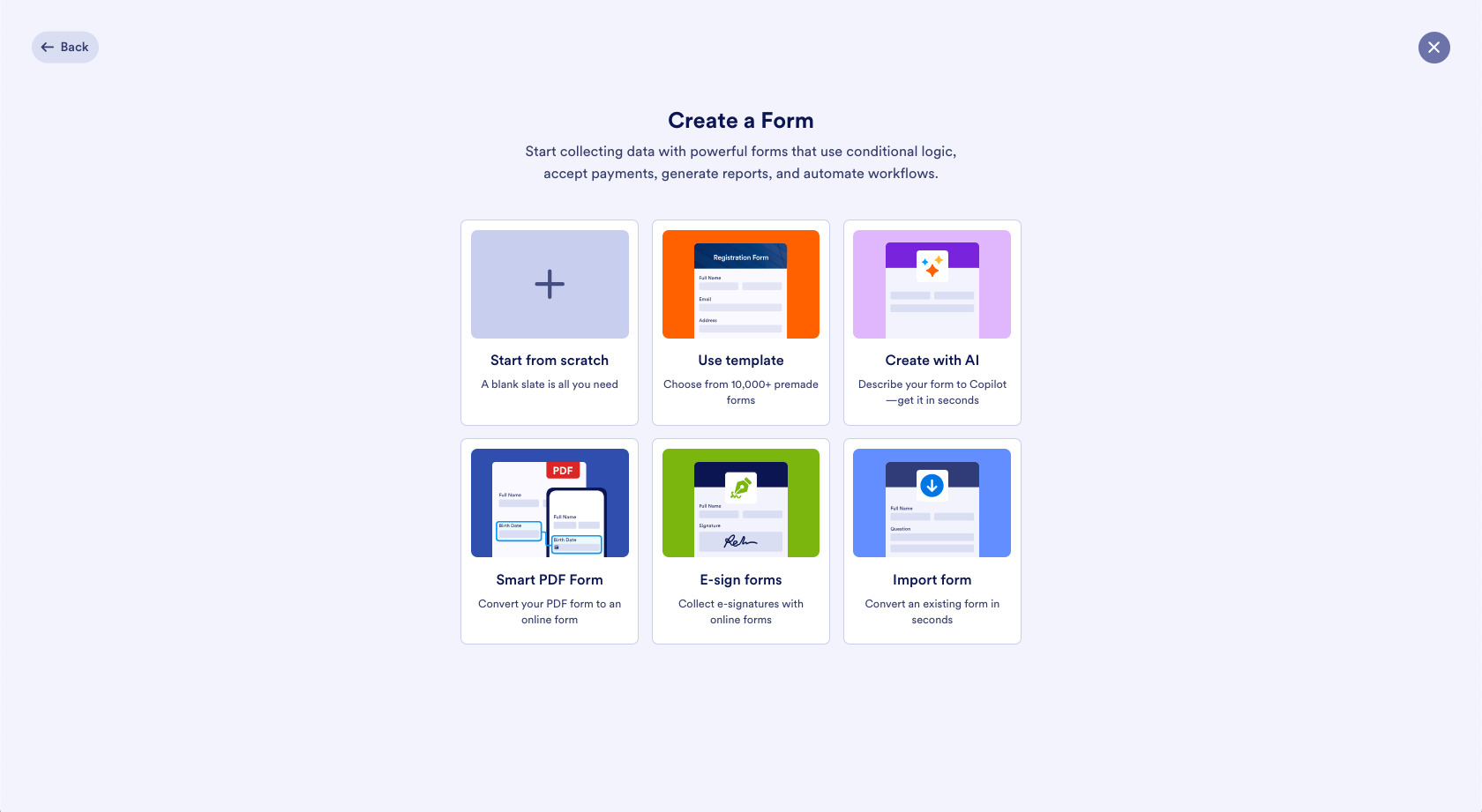 - Select the type of form you want to create. You can start a form from scratch, use a template, import a form, or more.