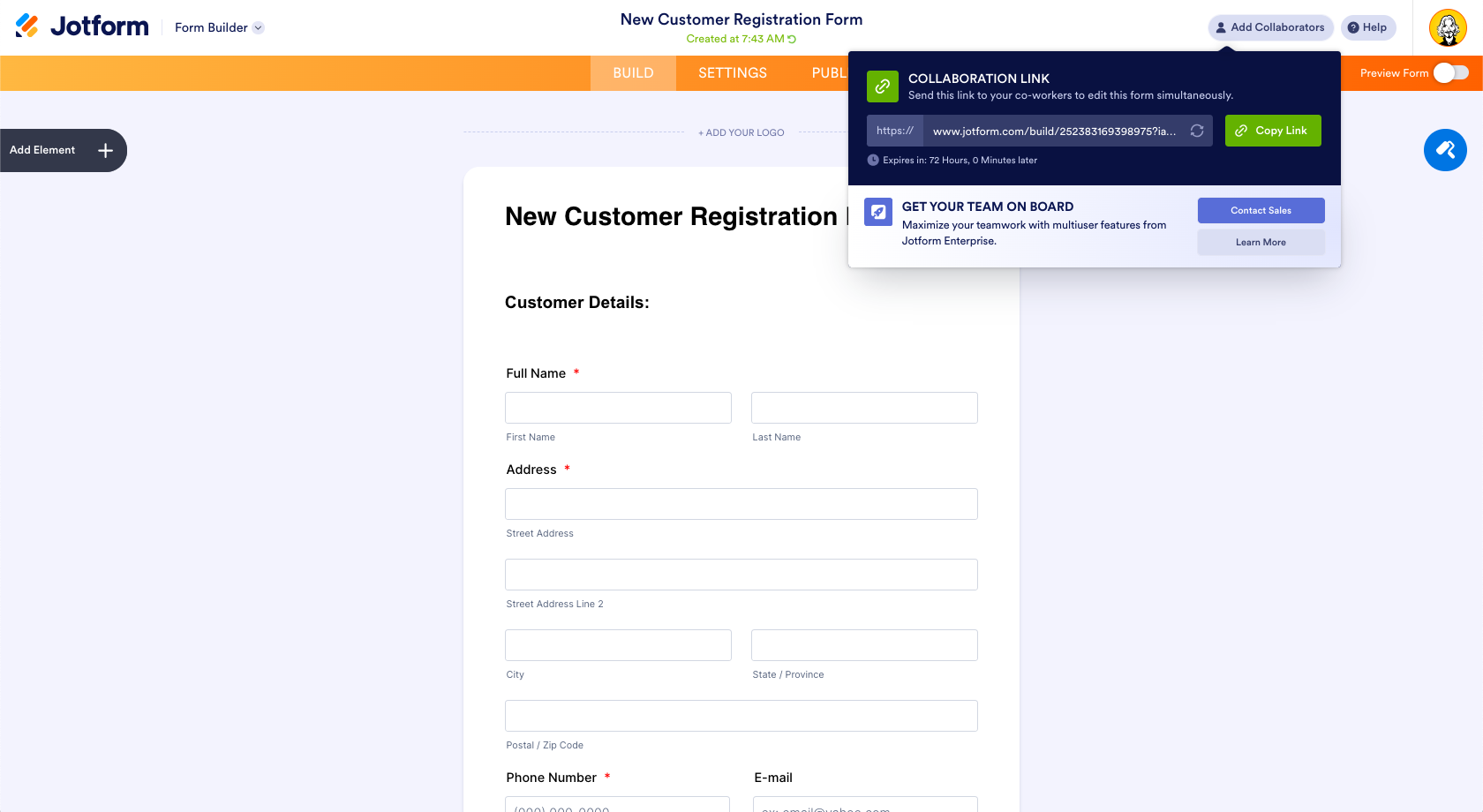 - Share this link with your collaborators via text message, email, or another channel. Users don’t need to have a Jotform account in order to collaborate with you on the Jotform form.