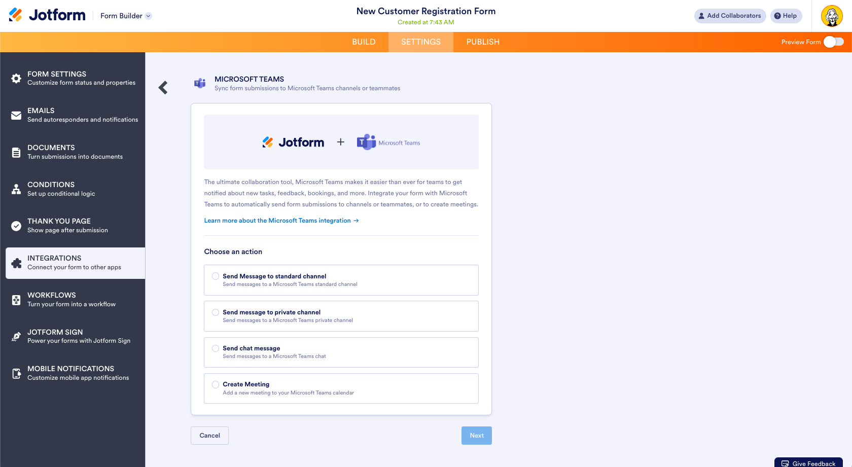 - Choose one of the listed actions for sending form submissions to Microsoft Teams and click Next. With the Jotform-Microsoft Teams integration, you can select from the following options: