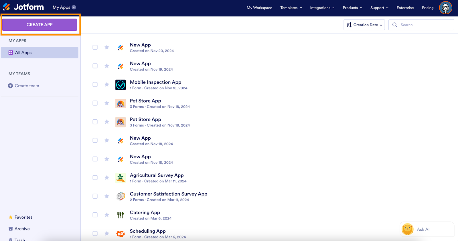 From My Workspace, click the dropdown next to the Jotform logo and choose My Apps.