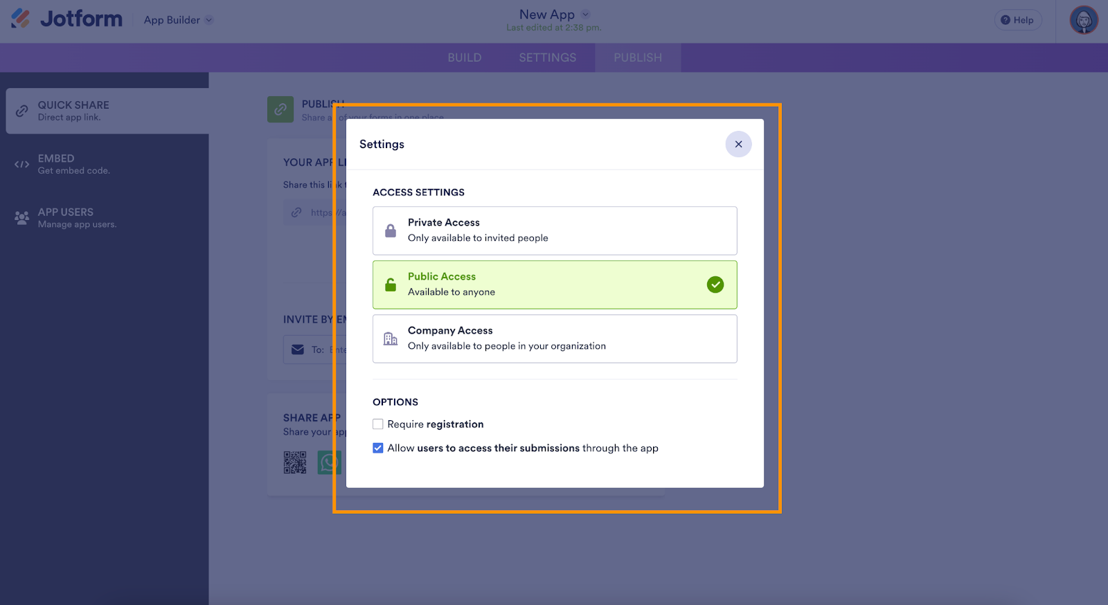 Click Publish → Settings and choose who can open the portal: Private (invite-only), Public (anyone with the link), or Company Access (email domain). For stricter portal security, require login.