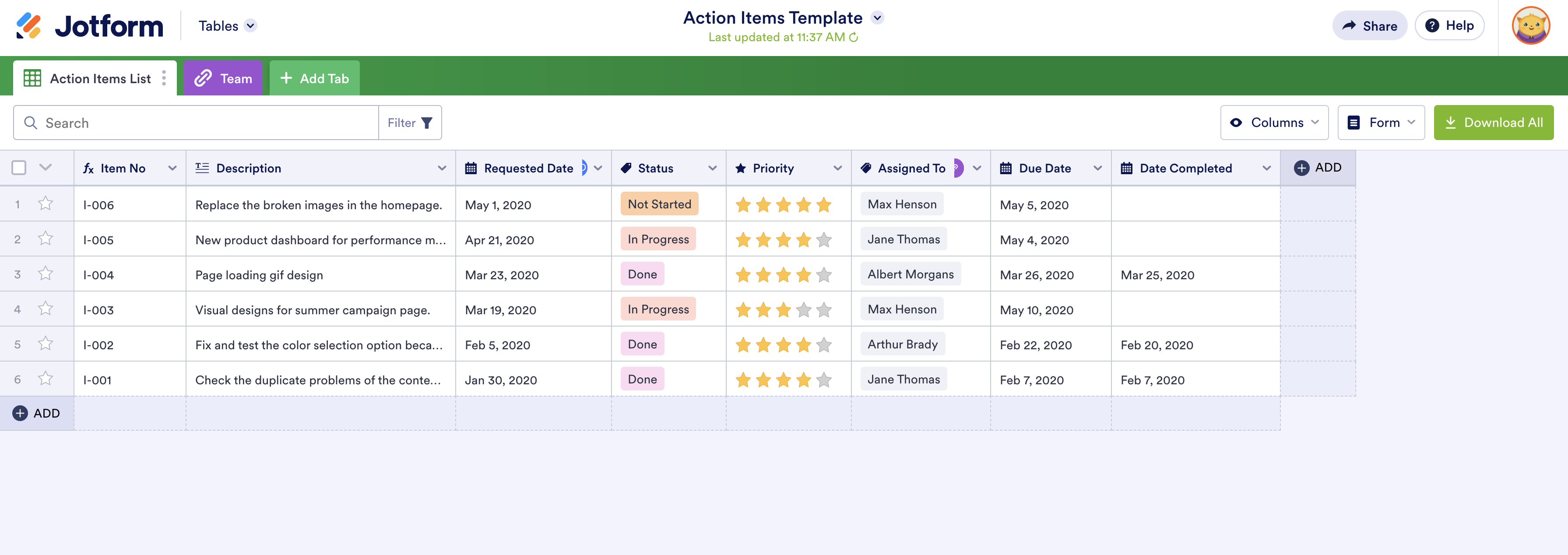 You can manually enter individual details for your project into Jotform Tables or import existing data. This information will live in Jotform, where you can edit and adjust it however you see fit.