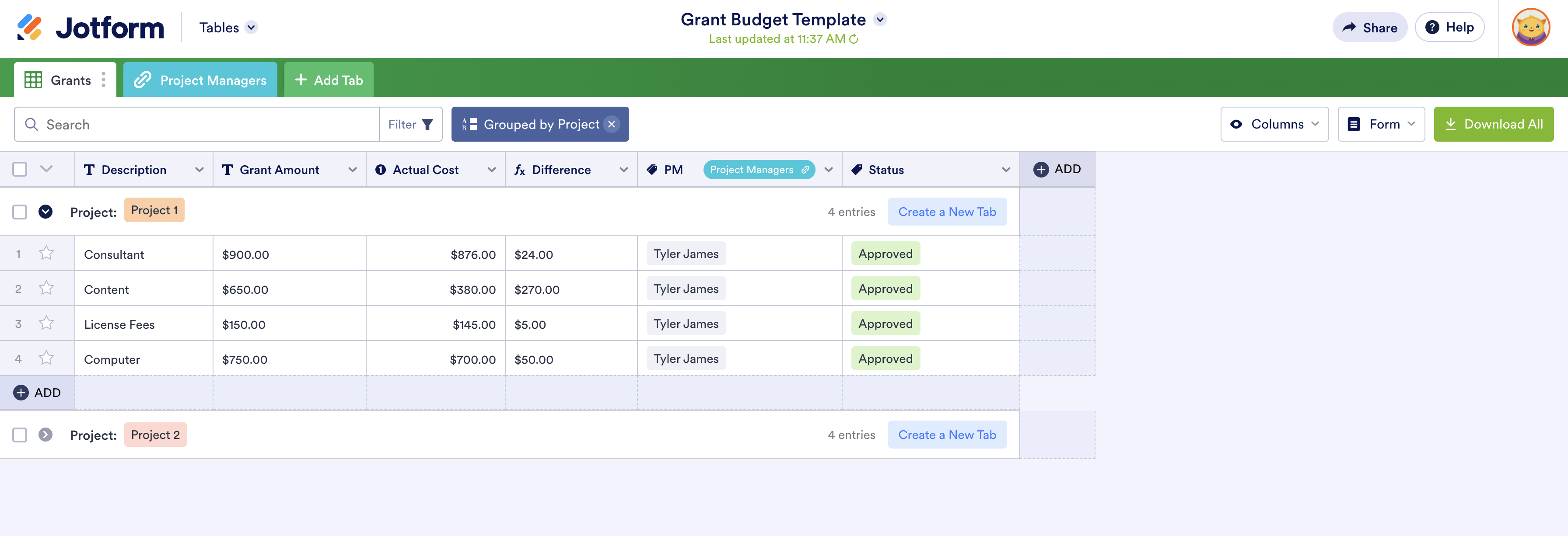 What’s more, with Jotform’s project budget template, you can manage multiple projects at once, use formulas to calculate costs, and organize your data in a way that makes sense to you.