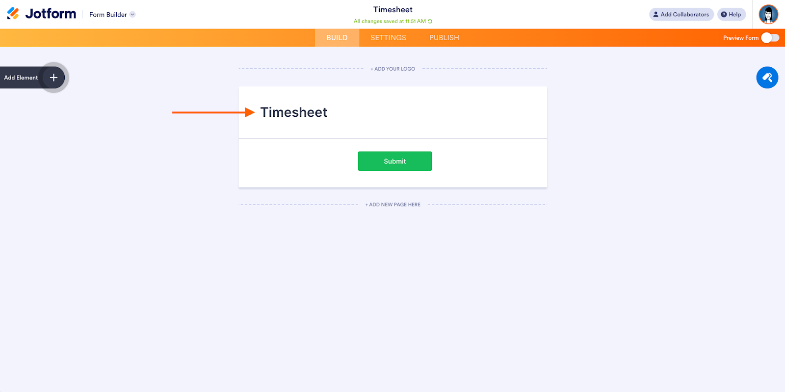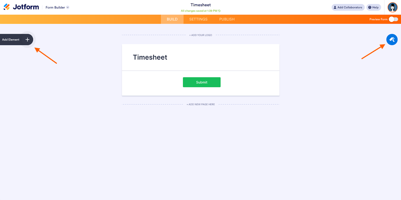 - To add fields to your timesheet, click the Add Element button on the left side of the Form Builder. To customize your form’s design, click the blue Form Designer (paint roller) button on the right.