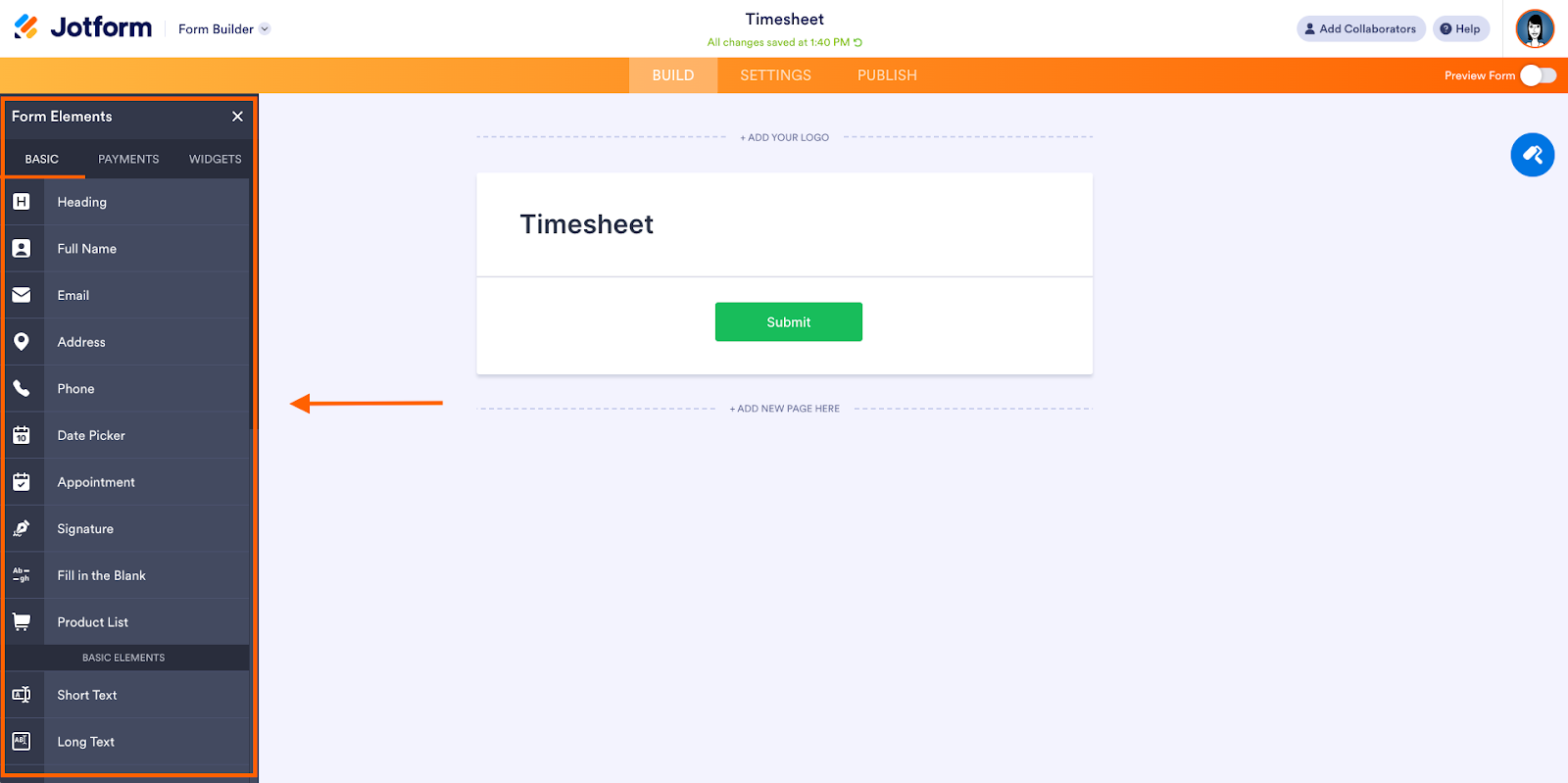 If you prefer to create your own unique timesheet, you can also build your form from scratch using Jotform’s drag-and-drop form builder.