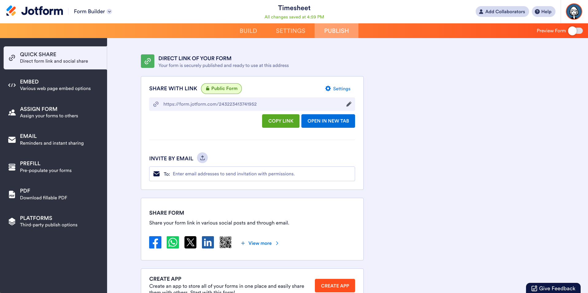 - To share your timesheet with your team, you have a few options. Click the Copy link button to send a link, enter an email address to send it via email, create a QR code, embed the form on your website, or share it through social media.