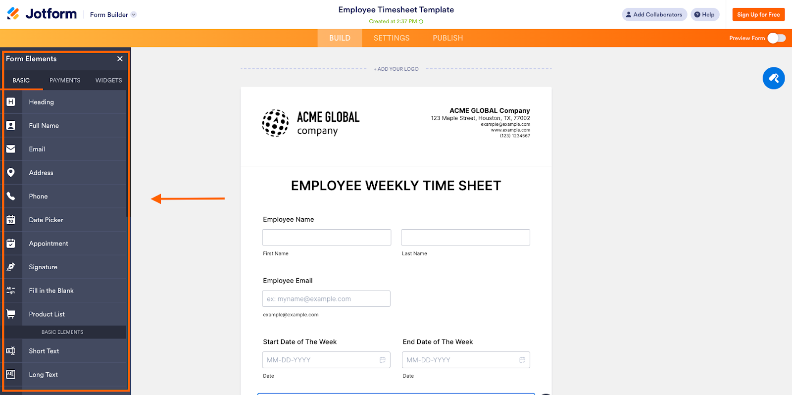 - Add elements to your timesheet by dragging and dropping them from the Form Elements menu on the left.