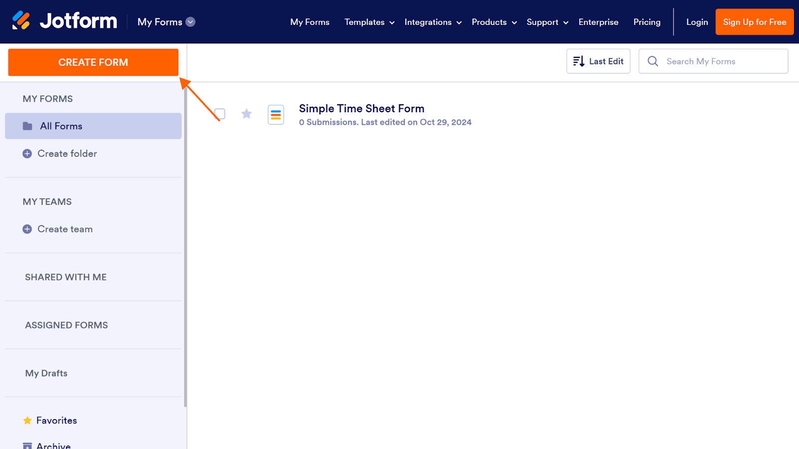 - Click on the orange Create Form button in the top-left corner.