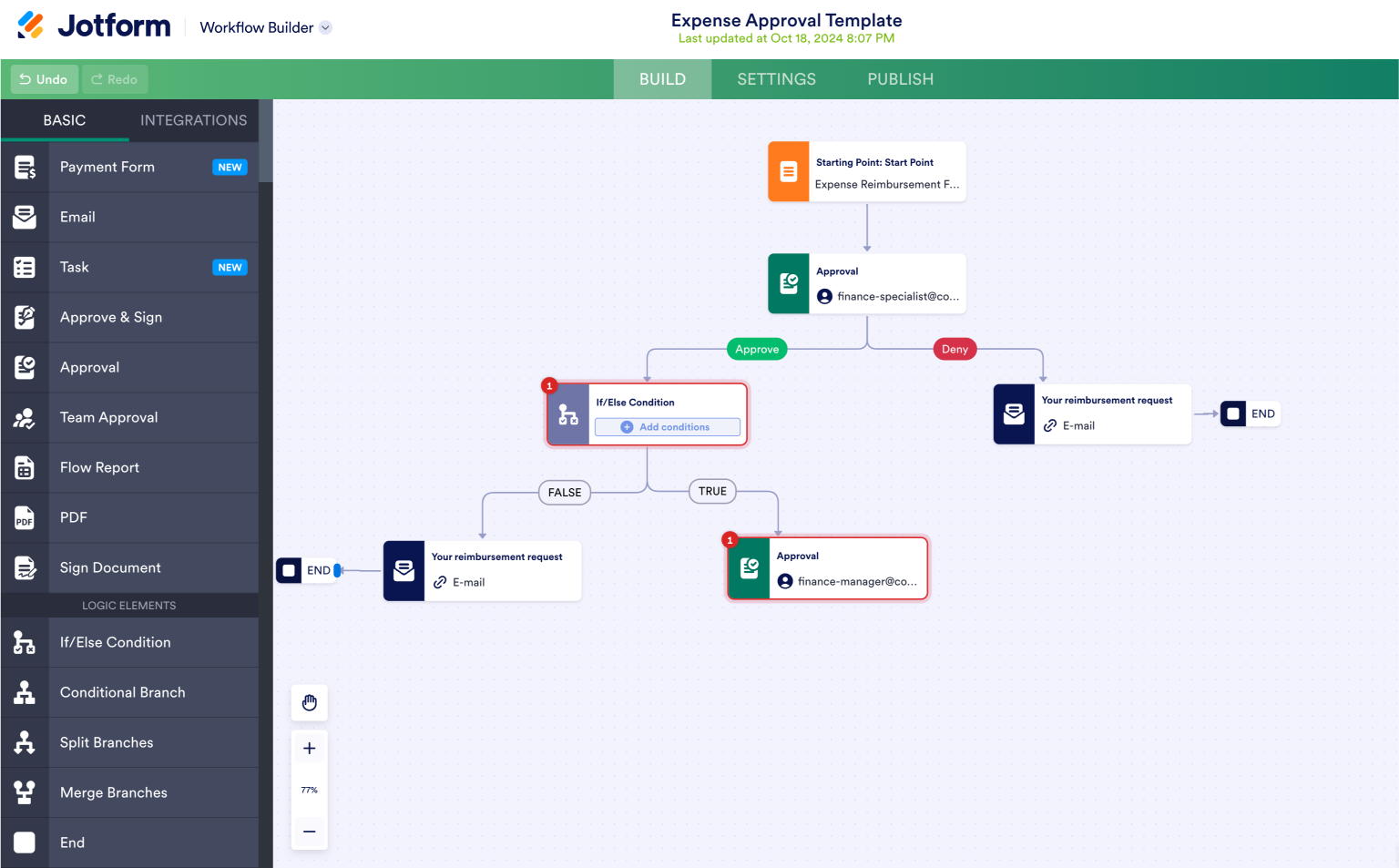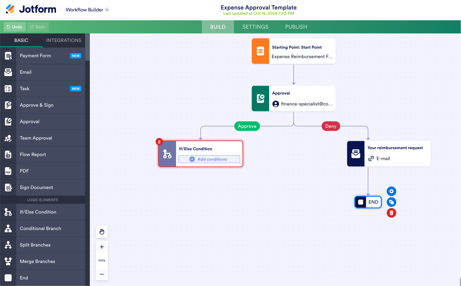 Here, we’ll assign submissions to our Expense Reimbursement Form to a finance specialist, who will either approve or deny it.