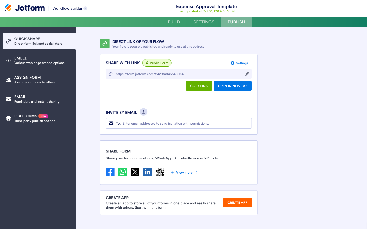 Alternatively, you could invite people to fill out your form by email directly from the Jotform platform.