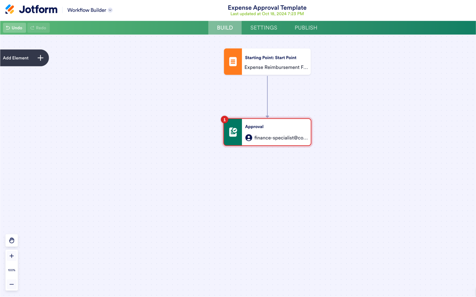- Click the Settings (gear) icon for the Approval element and enter the approver’s email address (in this case, the finance manager).