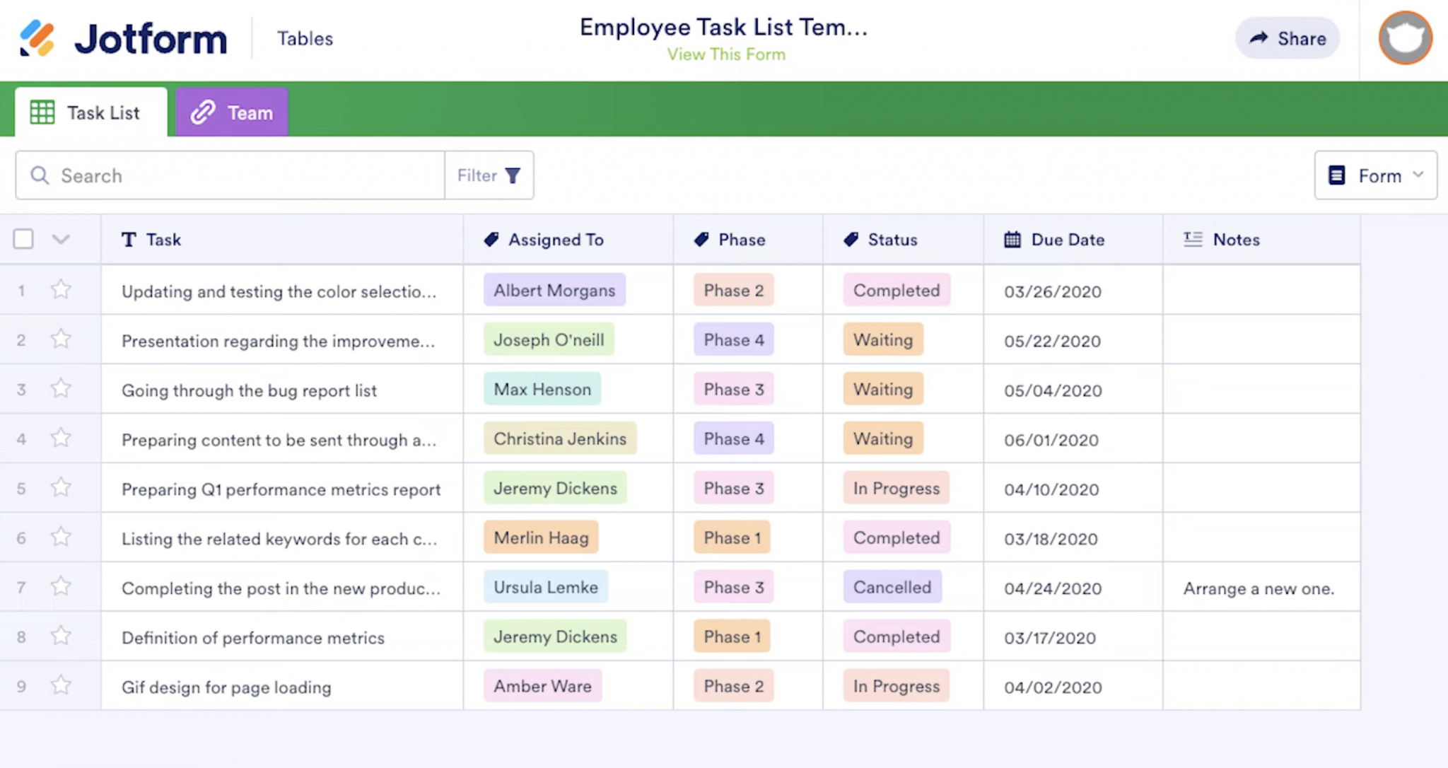 For example, the Jotform employee task list template is a free online tool that helps you assign tasks to employees and monitor their progress by setting deadlines for updates and milestones. Sharing the spreadsheet with your employee makes the process transparent for mutual accountability.